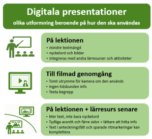 Tips på vad du kan tänka på när du gör en PowerPoint/presentation som ska användas på en lektion, som lärresurs eller för att spela in en filmad genomgång.
